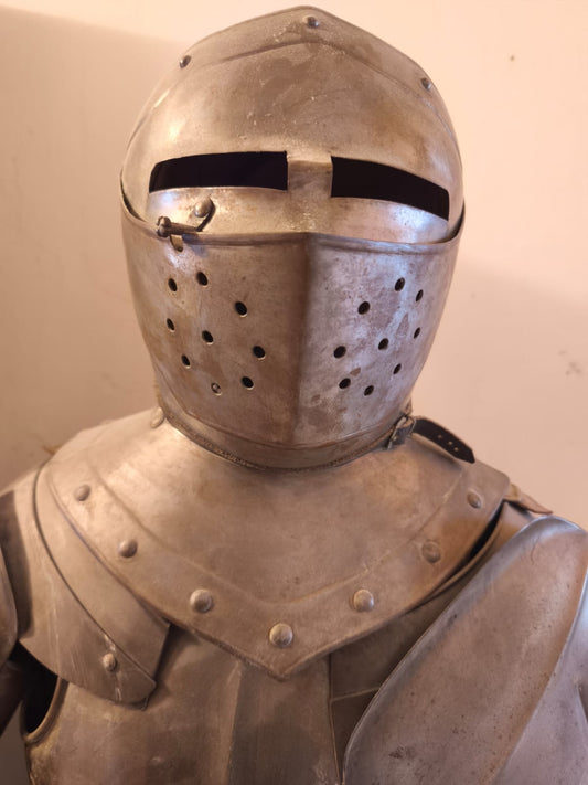 Armatura stile fine 1300 indossabile con spada e supporto legno.