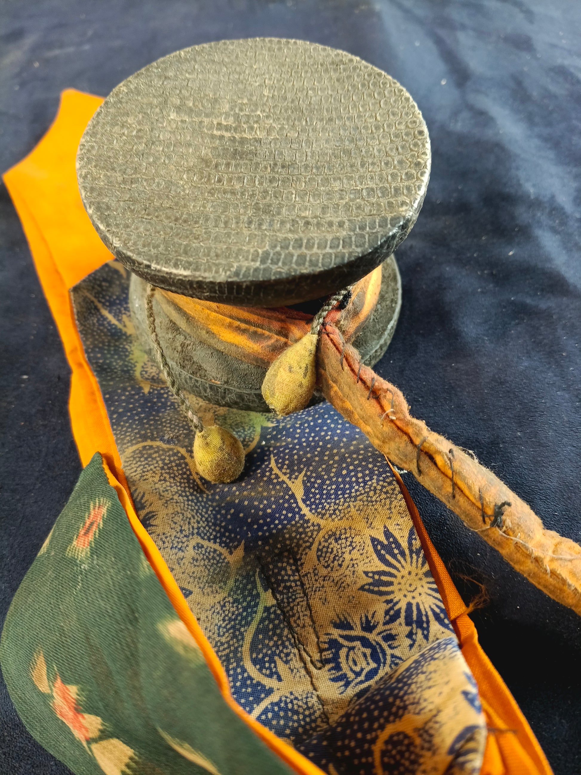 Il damaru è spesso fatto di legno, con una cassa a doppia faccia ricoperta di pelle, il nostro è pelle di serpente, per un collegamento con i Naga e le forze ctonie.