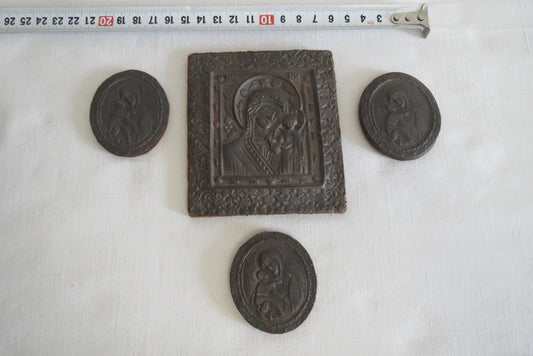 Groupe de 4 anciennes icônes orthodoxes pour enfants appelées en Russie « Bogomater » ou « Marie et l'Enfant ».