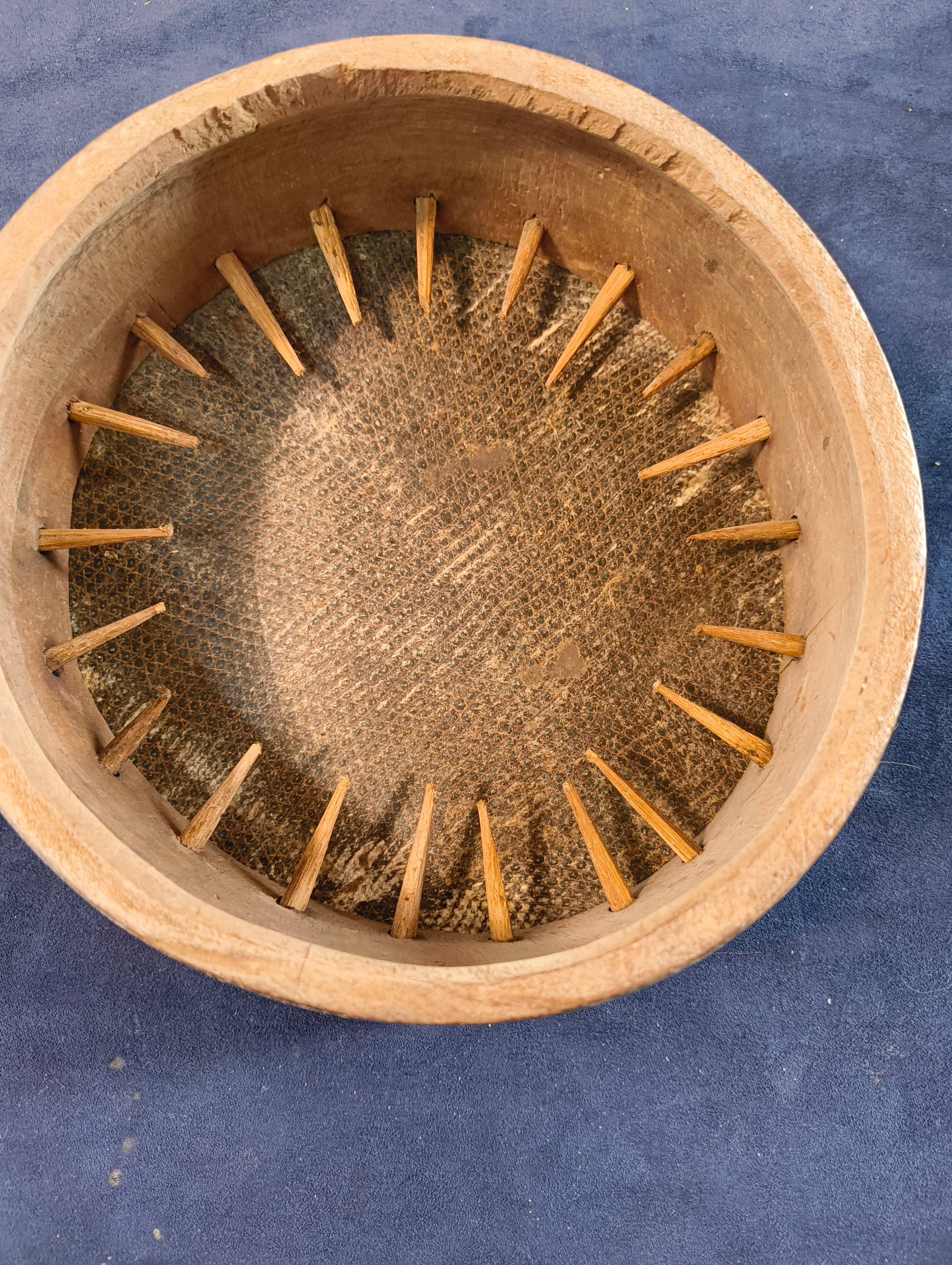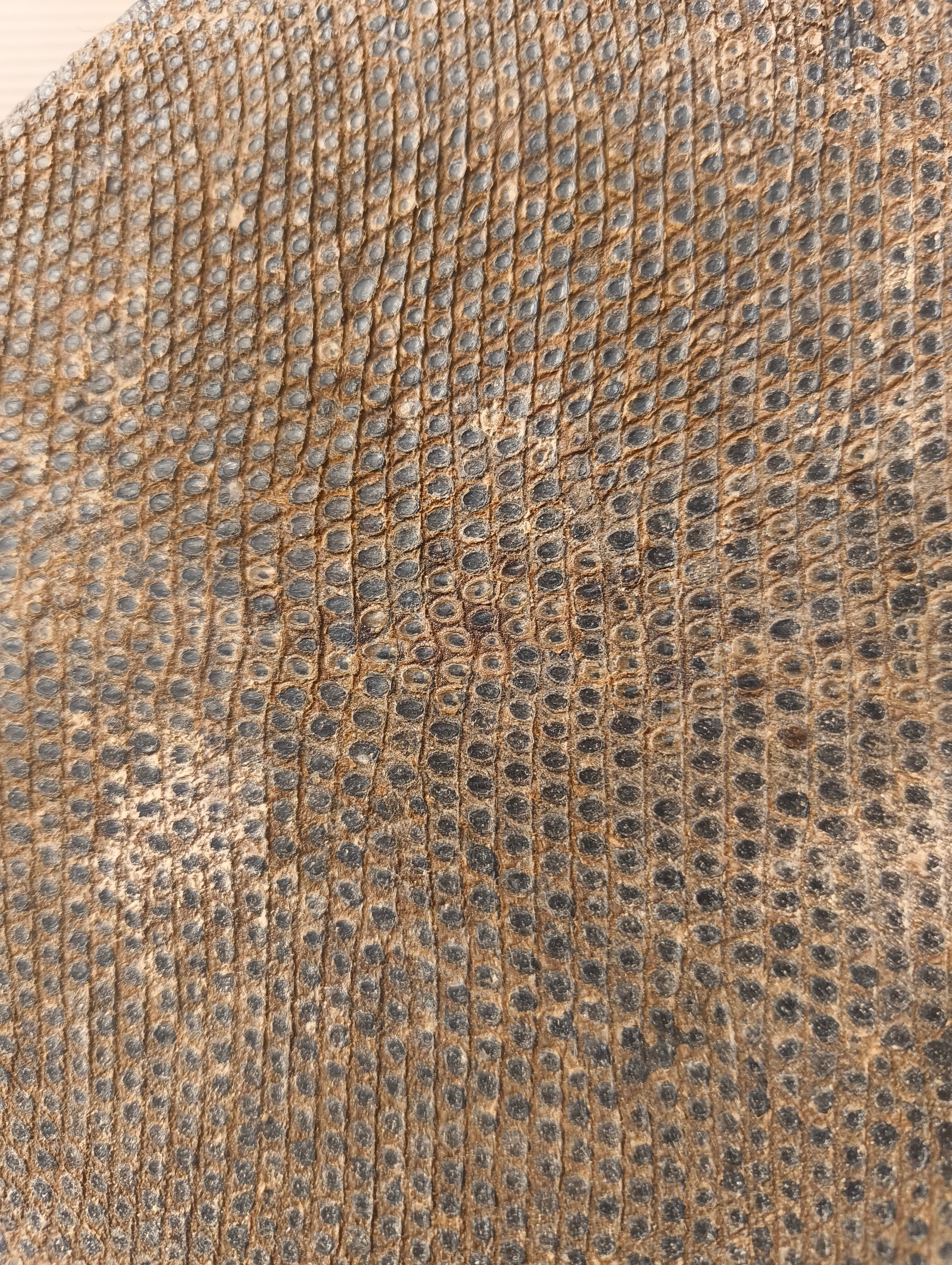 Bordure en bois et cuir "peau de serpent" fixée au bord en bois avec des épingles en bois.
