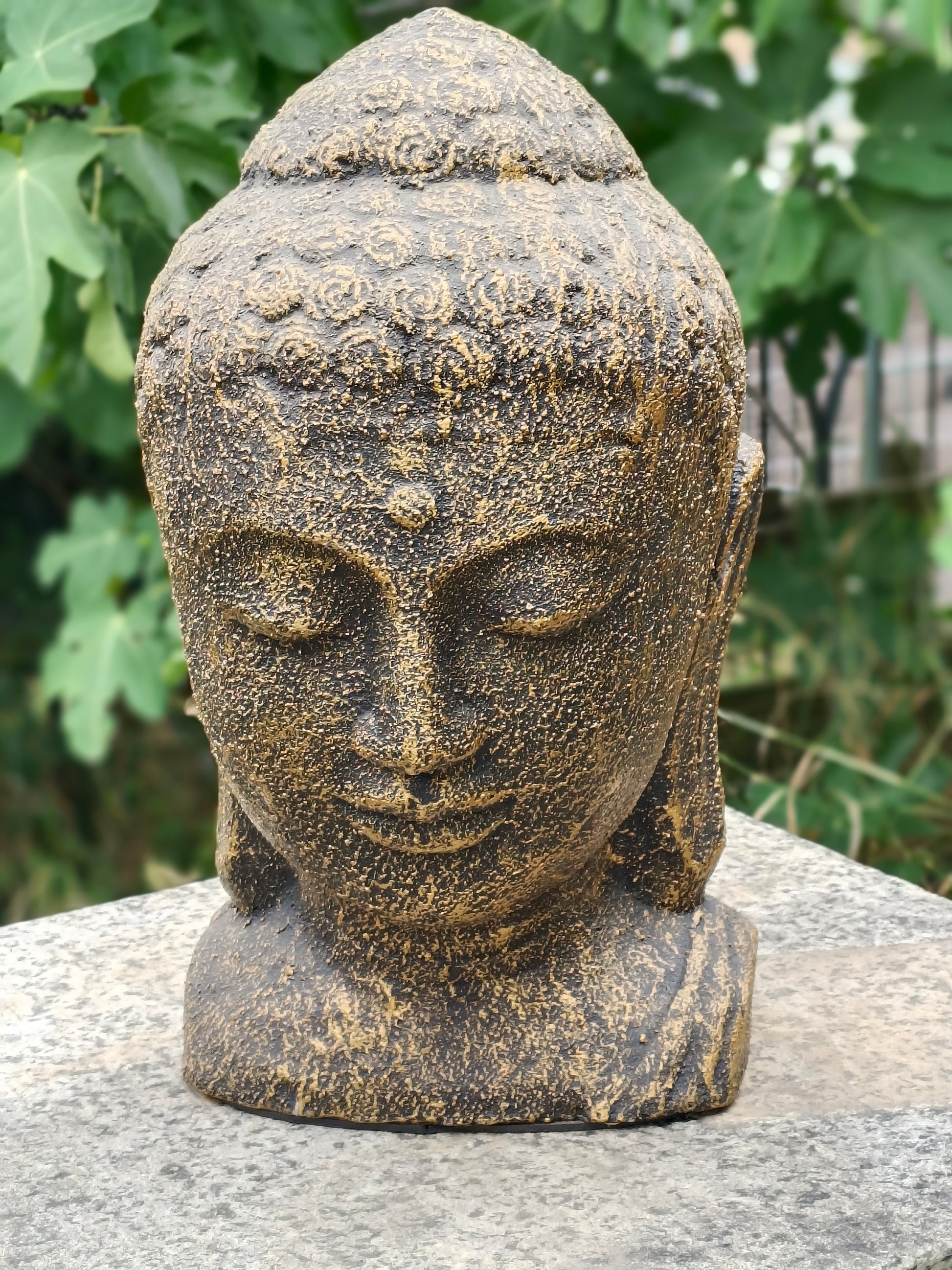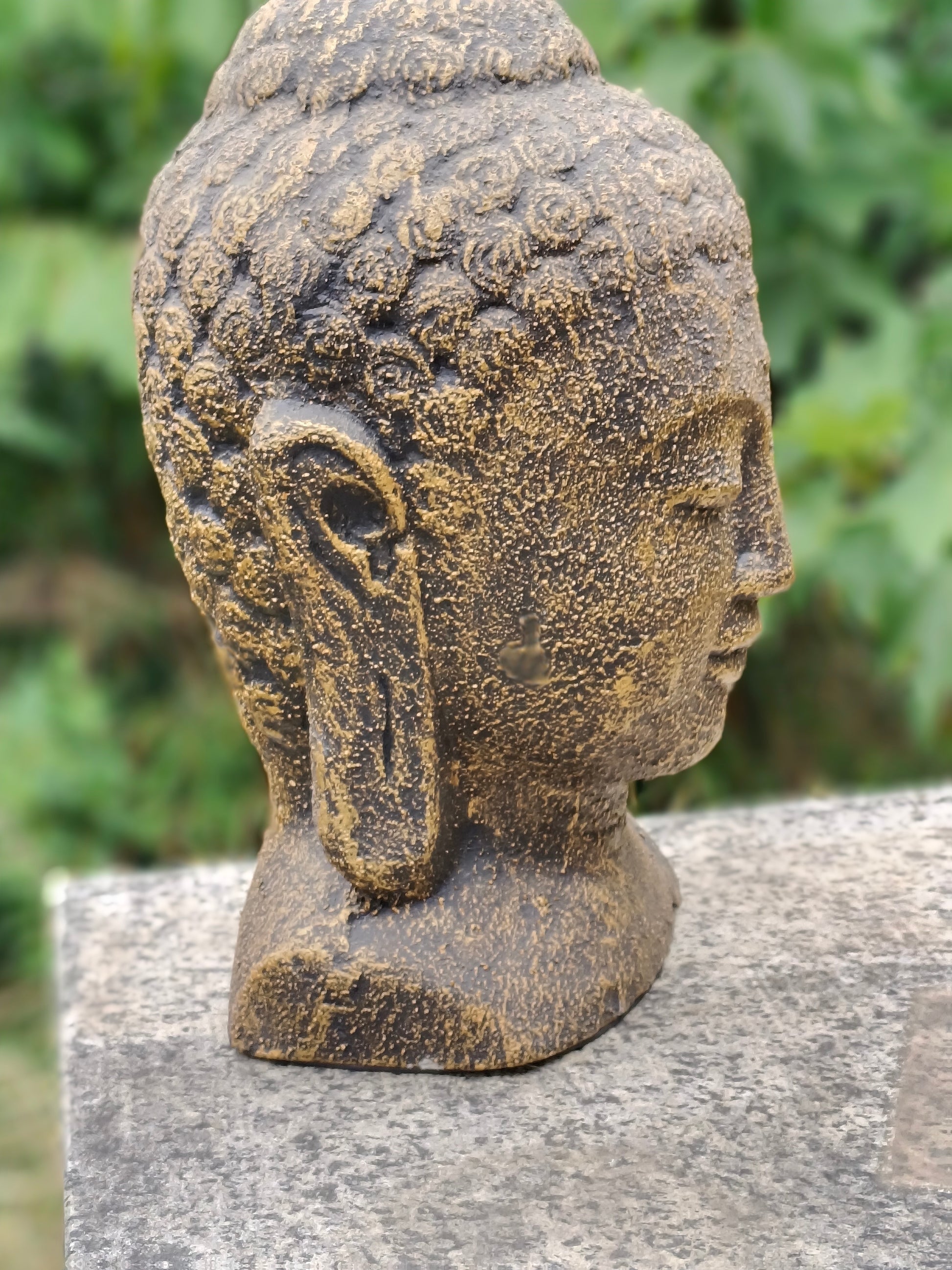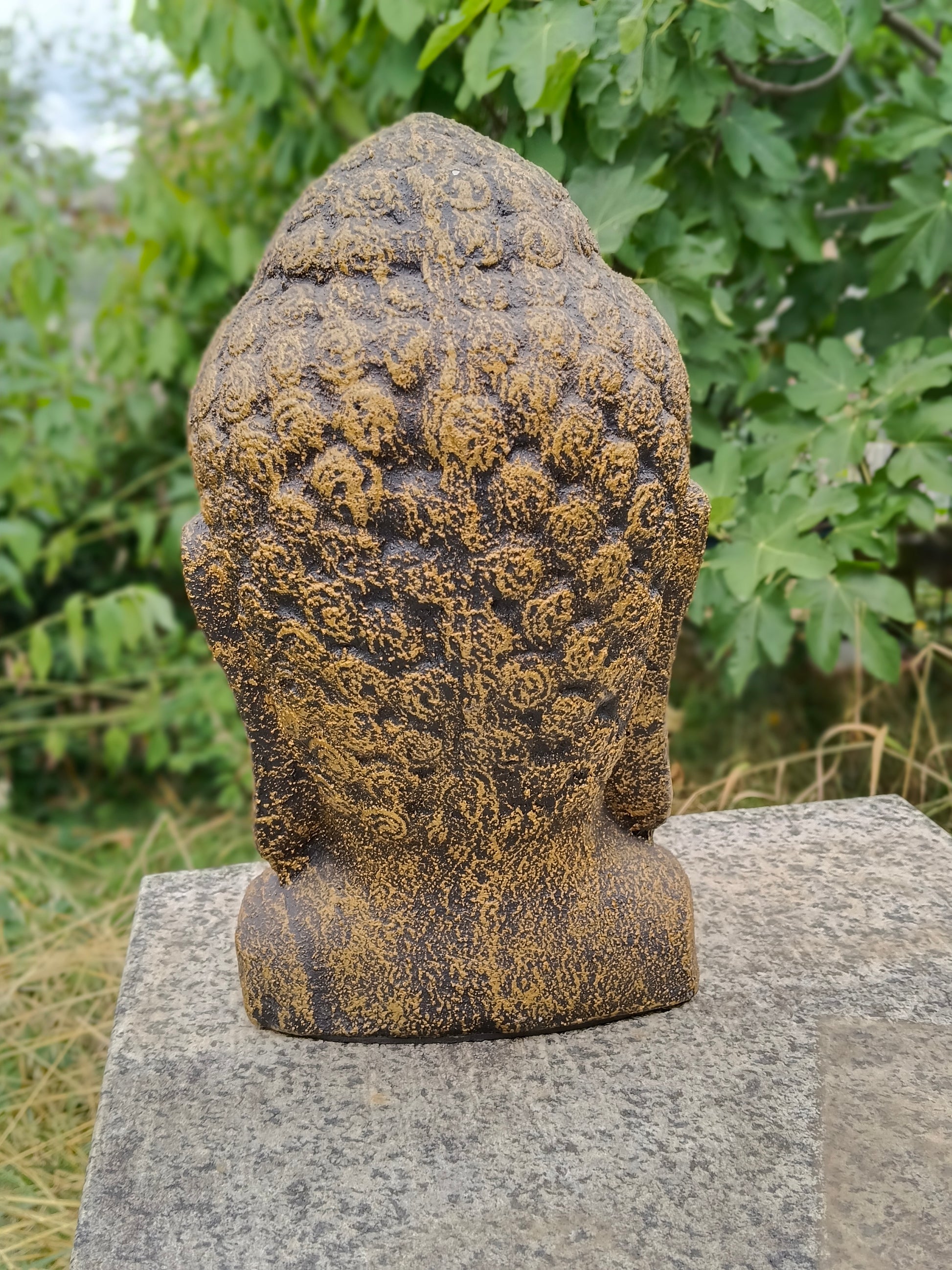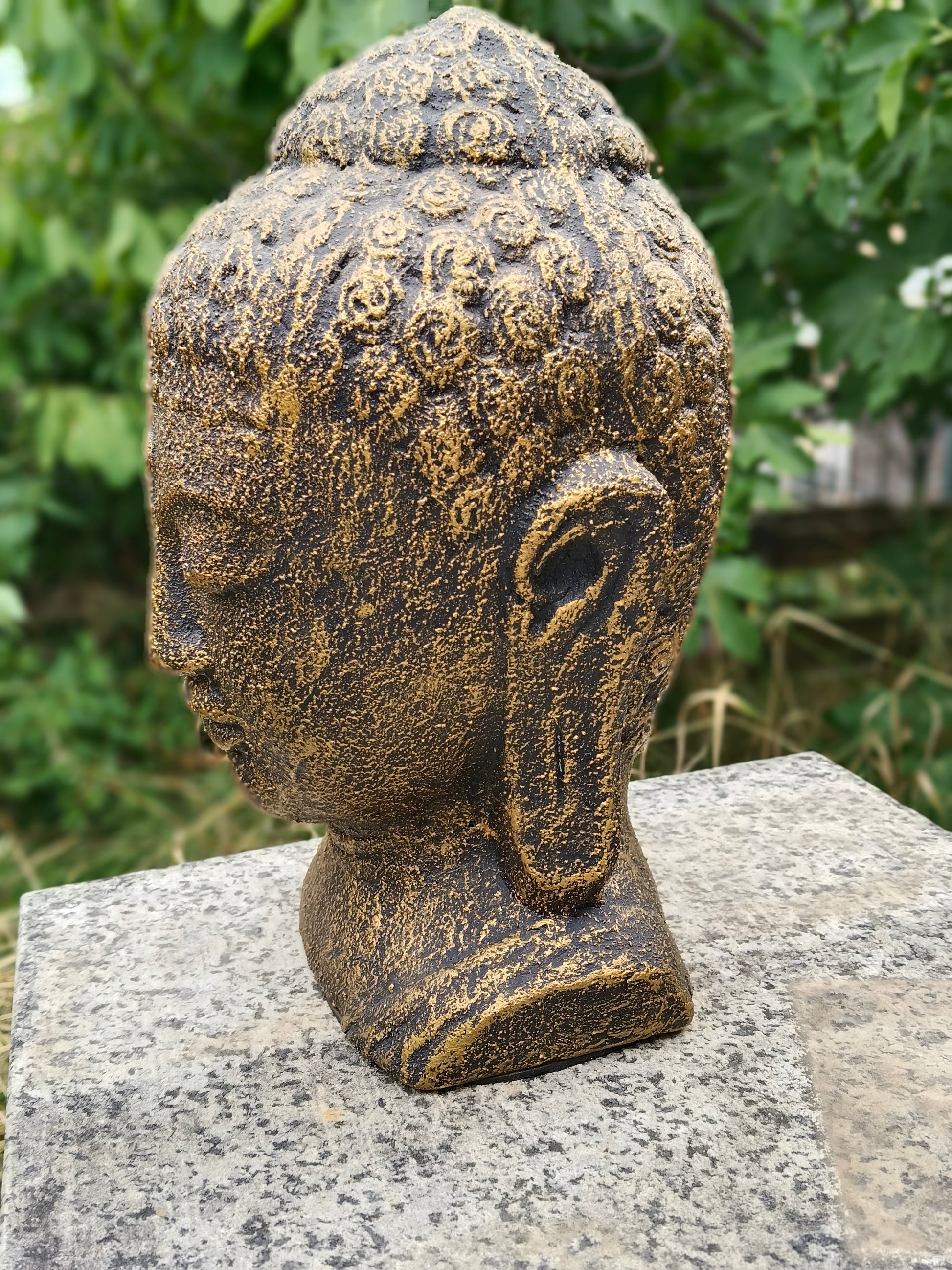 Testa di Buddha in materiale polimerico e gesso acrilico rinforzato con strisce di vetroresina all'interno, colorato a mano per un effetto antica pietra bronzo/dorata.
