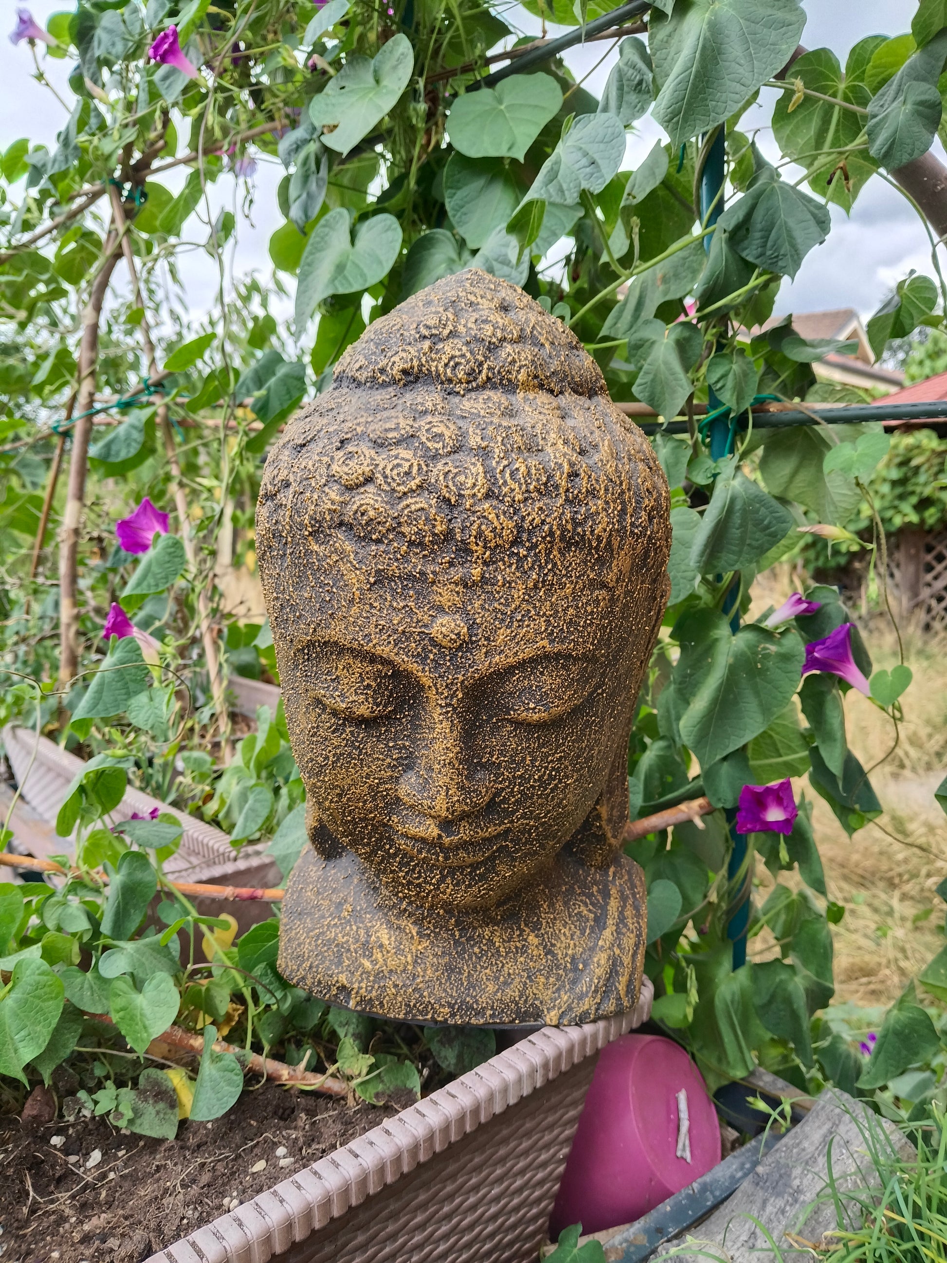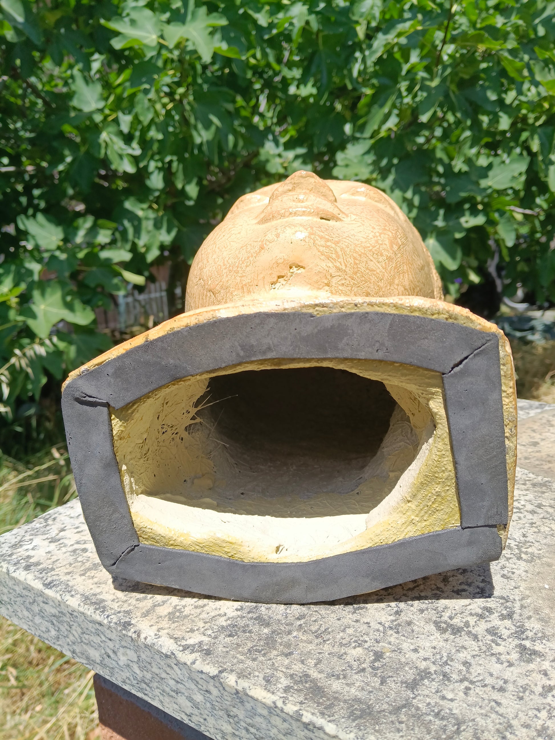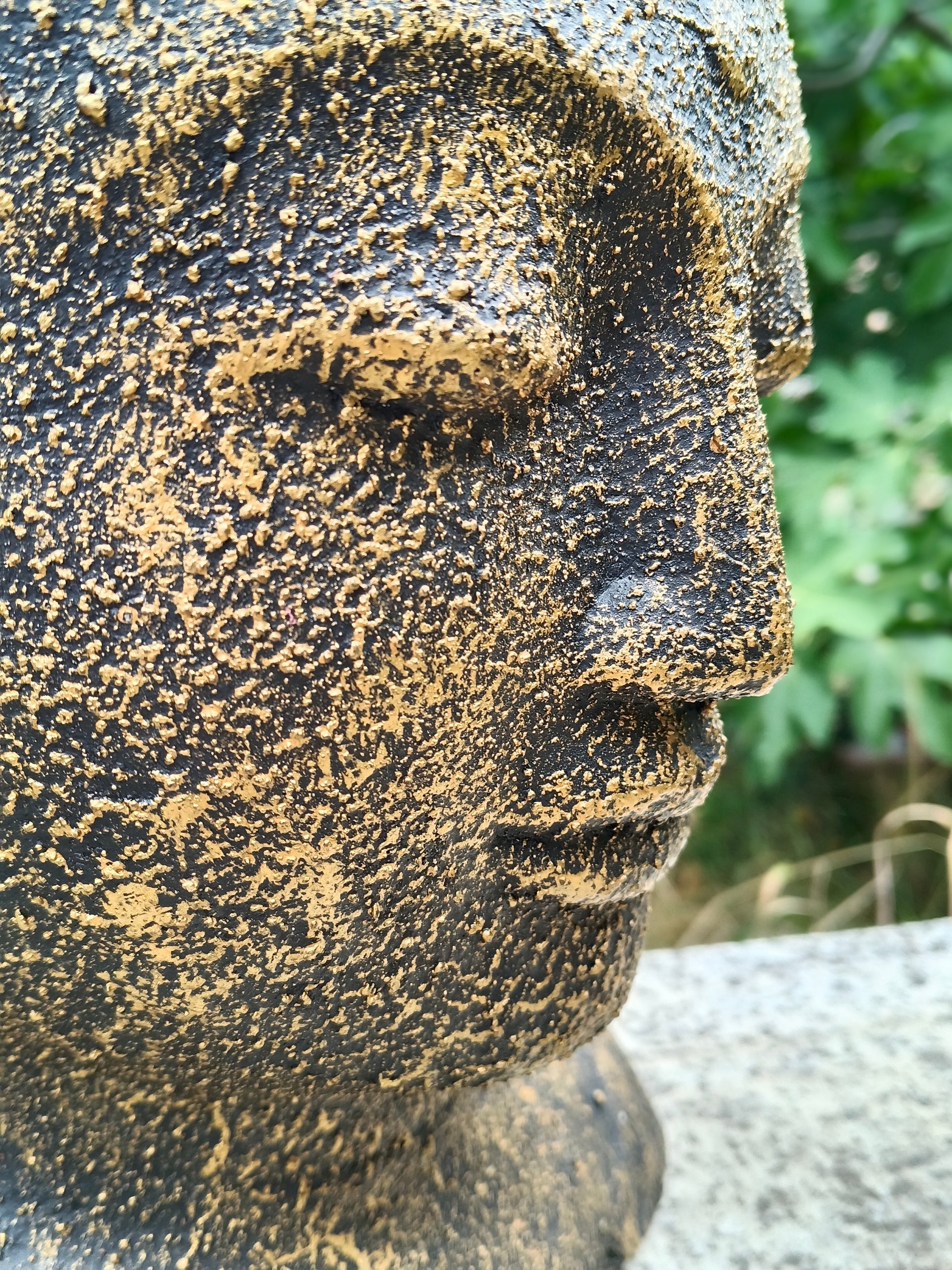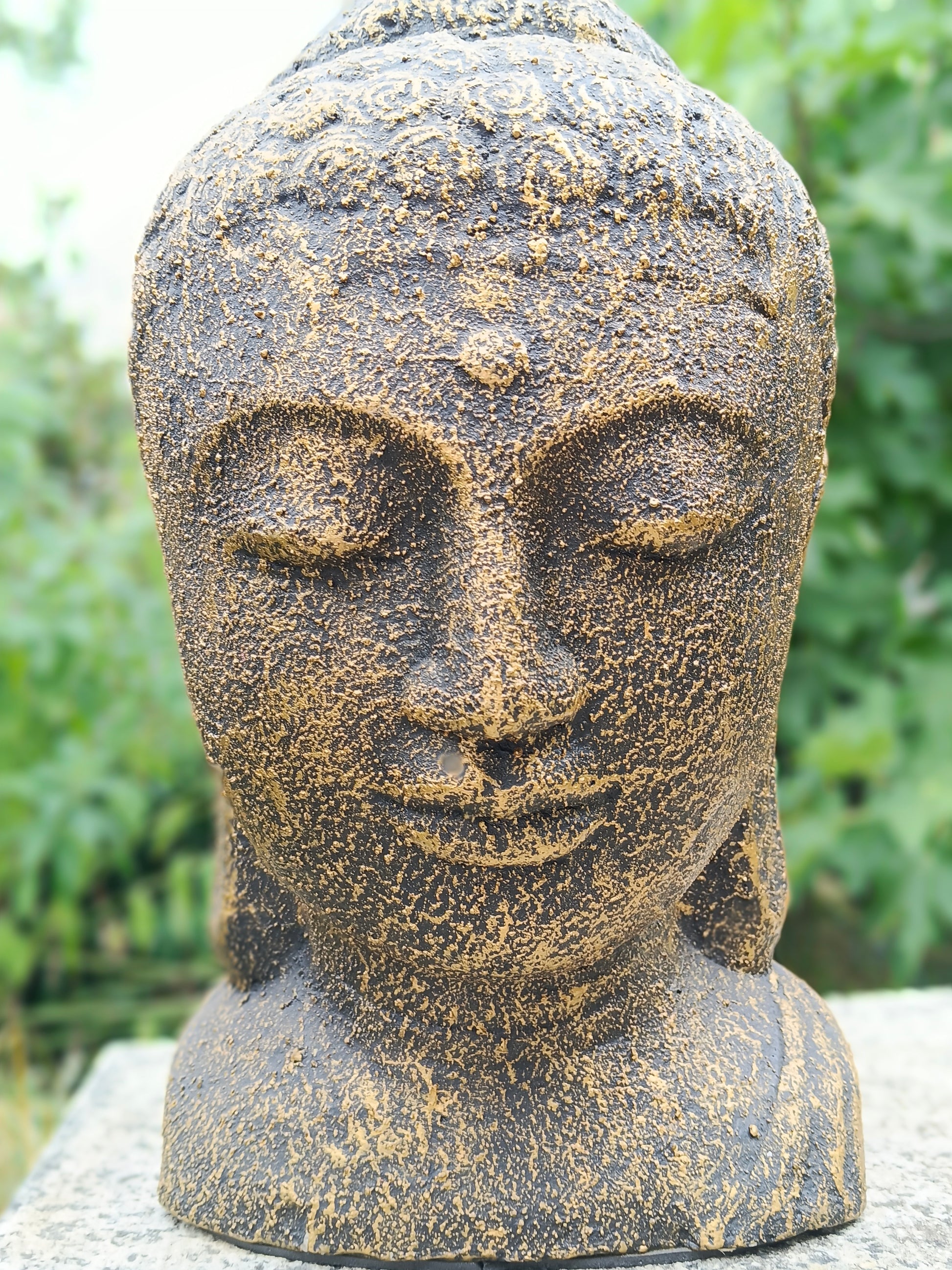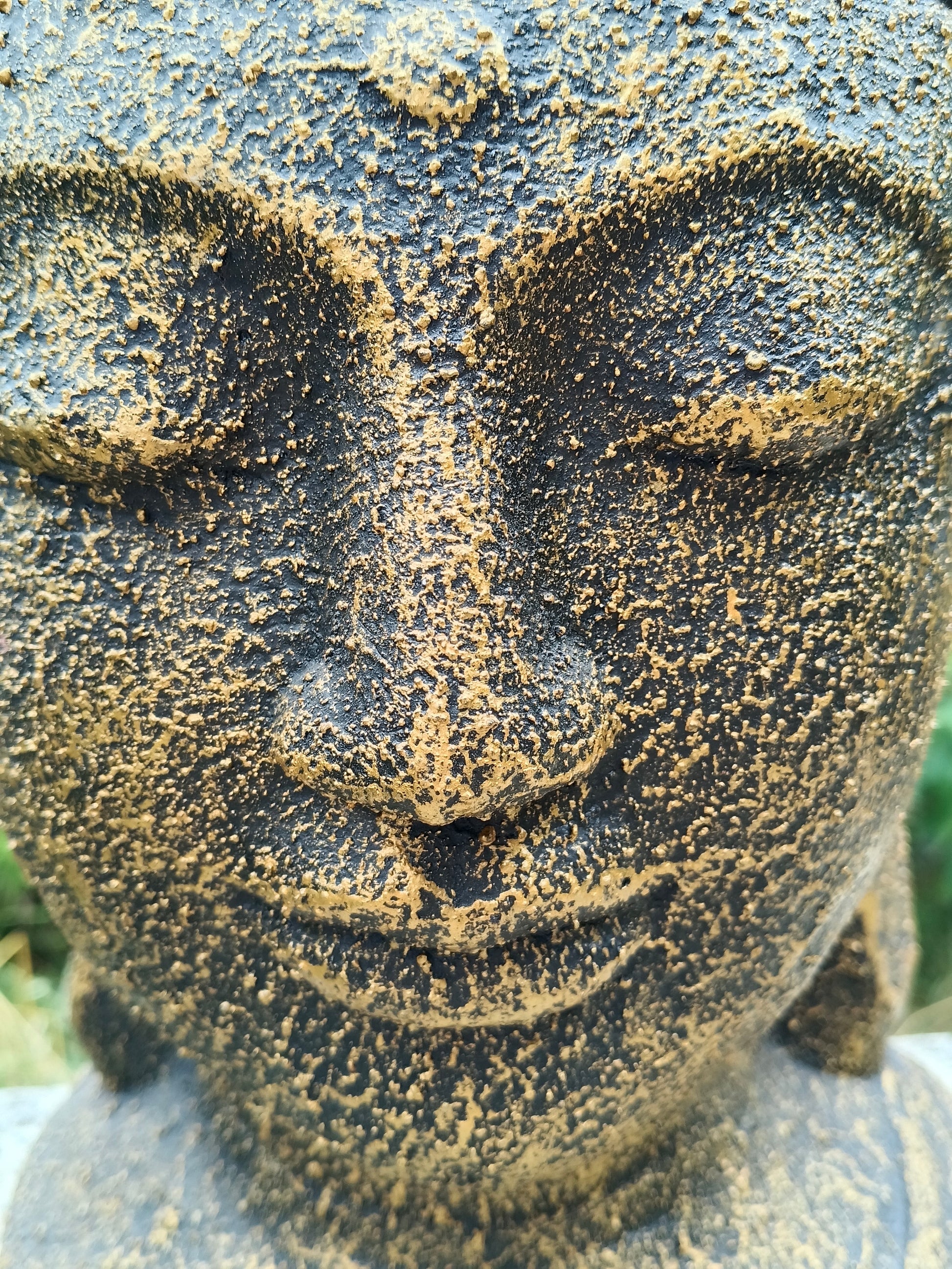 Testa di Buddha in materiale polimerico e gesso acrilico rinforzato con strisce di vetroresina all'interno, colorato a mano per un effetto antica pietra bronzo/dorata.